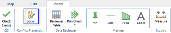 You can open the locks table from the Conflict Prevention group of the Review tab. Clicking the Locks button opens the locks table.
