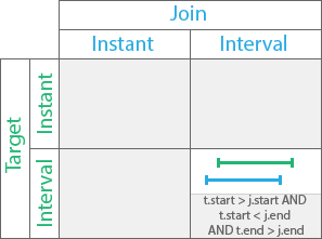 Die folgende Tabelle listet die unterstützten zeitlichen Beziehungen für eine zeitliche Verbindung zwischen Zeitdatentypen auf (z. B. Verbindung von Zeitintervallen mit Zeitpunkten):