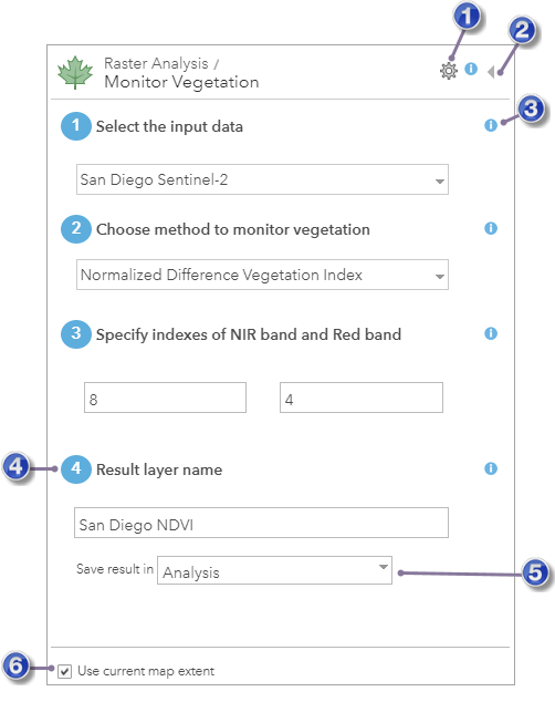 Klicken Sie zum Öffnen eines Raster-Analysewerkzeugbereichs auf die Schaltfläche für das Werkzeug. Dadurch wird der Eingabebereich des Werkzeugs geöffnet (wie hier am Beispiel des Werkzeugs "Vegetation überwachen" dargestellt).