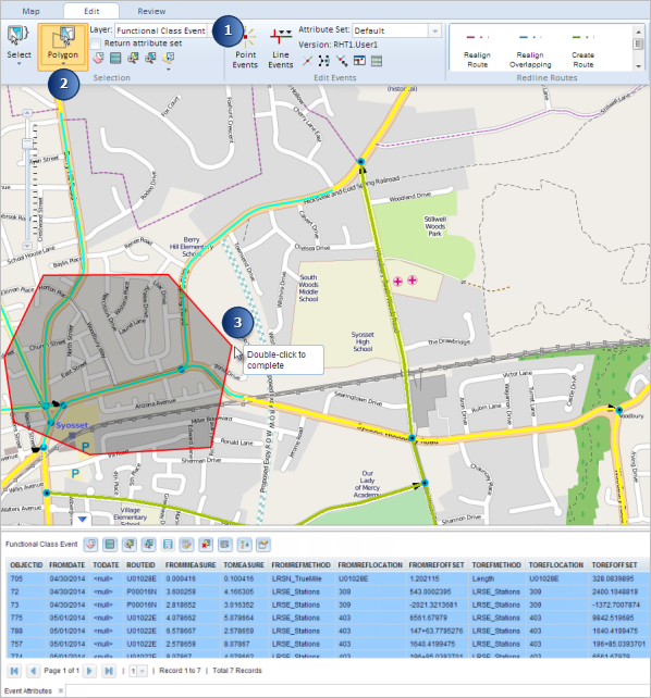To select events, routes, or point features by drawing a polygon on the map, perform the following steps.