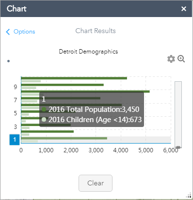 Ein Diagramm stellt die Attributwerte eines einzelnen Feldes, aggregierte Werte für mehrere Felder oder die Gesamtanzahl für Features dar. Ein Balken- oder Säulendiagramm stellt die Attributwerte mehrerer Felder als gruppierte Balken und Säulen dar. Wenn Sie das Widget "Diagramm" verwenden, können Sie auch einen räumlichen Filter einsetzen, um für das Diagramm nur gewünschte Features anzufordern.